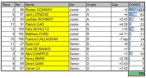 | Junior Male C | 10:00 AM | 10:35 AM | 10:40 AM | 15min + 2laps |